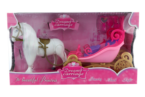 Krásný koník s kočárem. Materiál plast. Výrobek je na baterie 3xAG13 (jsou součástí( a 2xAA (nejsou součástí). Kočár po suštění svítí, koník řehtá a jde. Baleno v krabici. Rozměry balení cca 38x22x14 cm. Věk 3+ prečítať celé