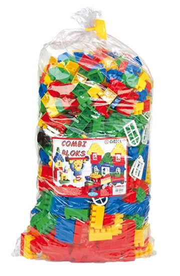 Velký pytel s barevnými plastovými kostičkami obsahuje kromě základních tvarů i další prvky - okenice, dveře či kolečka. Změna barev vyhrazena, Rozměry: 29 x 20 x 60 cm prečítať celé
