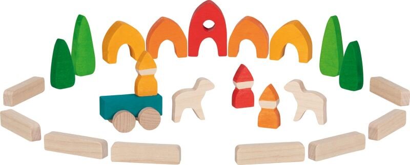 Klocki drewniane dla dzieci Moja mała farma Goki to zestaw do zabawy polecany już dla 3-latków!W komplecie z serii Goki Evolution znajduje się 25 elementów z fabułą w stylu wsi.Wśród nich znajdują się klocki w następujących kształtach:3 pracowników farmy,2 zwierzątek kopytnych,ciągnika na...