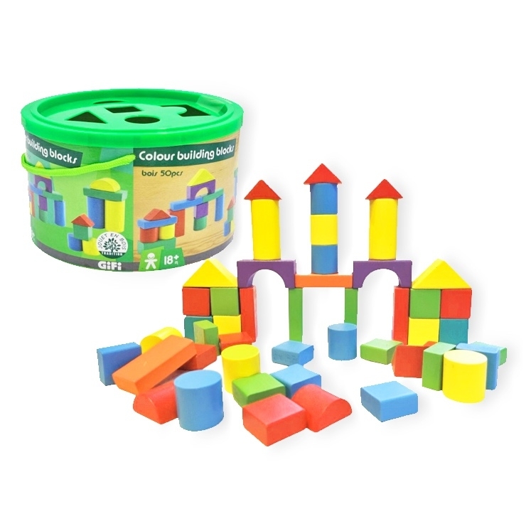 Kdo postaví nejvyšší věž? Barevné dřevěné kostky 50ks v krabici.Také i jako edukační hračka, kde na víku jsou rozmístěny otvory v geometrických tvarech umožňující vkládat kostky.Nevhodné pro děti do 3 let. prečítať celé