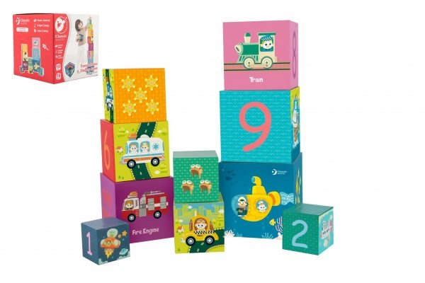 Sada 10 stohovacích kostek, ze kterých si děti mohou postavit věž (pyramidu) vysokou až 111,5 cm i jiné tvary. Kostky jsou z pevného kartonu s krásnými ilustracemi dopravy, zvířátek, číslovek a různých motivů. Kostky jdou složit do jedné velké kostky 15,5 x 15,5 x 15,5 cm.