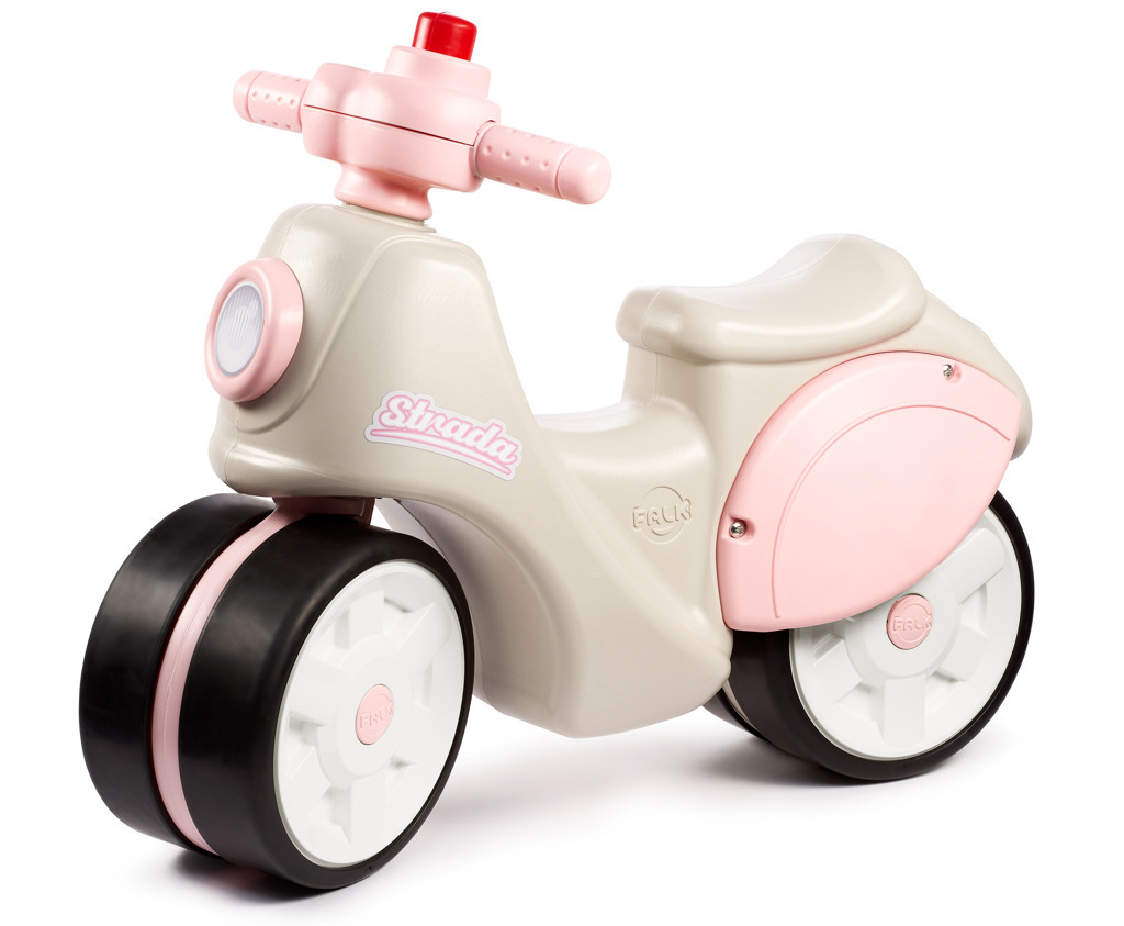 Odrážedlo skútr Strada bílo/růžové s klaksonem a tichými kolečky.Velikost 59×24×48 cm. Věk 1+. Všechna odrážedla jsou testována na30kg – dle požadavků evropských norem. Vyrobeno ve Francii. prečítať celé