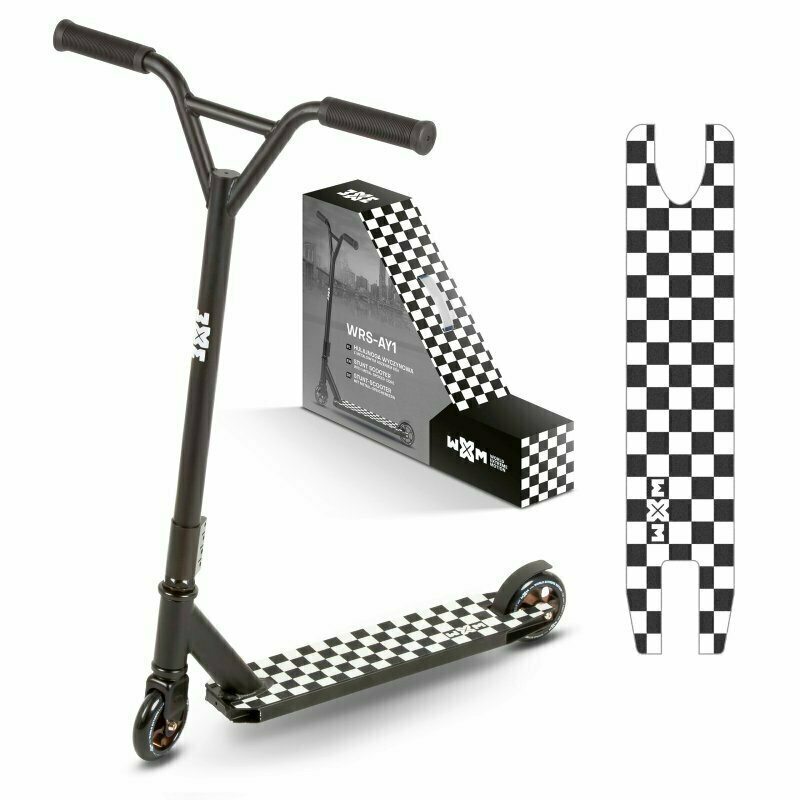 Hulajnoga wyczynowa WXM WRS-AY1 z metalowym rdzeniem kół.Cechy:- wysokość kierownicy od podłoża: 83cm,- szerokość kierownicy: 48cm,- gripy TPR o długości 12cm,- antypoślizgowy deck o wymiarach: 10x48cm- koła 10cm, PU 82A,- maksymalne obciążenie: 100kg,- zgodna z normą: EN 14619:2019- łożyska...
