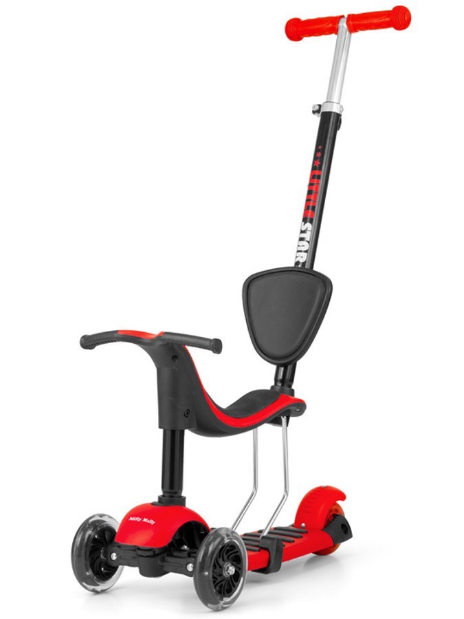 Super stylová dětská koloběžka Milly Mally Little Star. Není to jen koloběžka, je to také odrážedlo pro děti od druhých narozenin, které má sedadlo i vodíci tyč pro rodiče. Nosnost do 20 kg. Sedadlo i vodíci tyč lze jednoduše sundat a z odrážedla se rázem stane koloběžka s nosností do 50 kg. Je...
