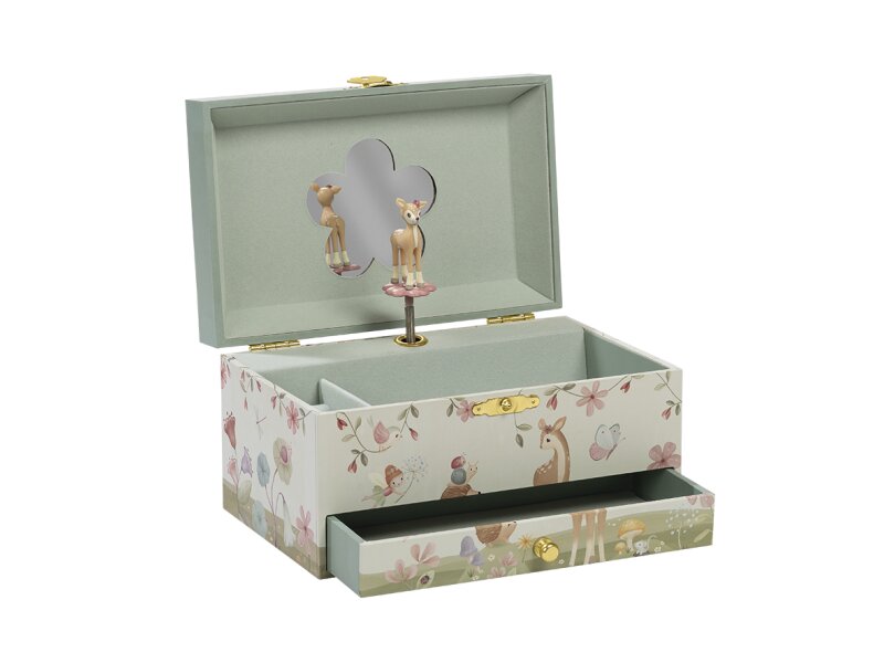 Krásná šperkovnice se zrcátkem a hudebním boxem, který po natažení hraje něžnou melodii. Vaše malá parádnice si do šperkovnice s potiskem motivů ze života v lese může ukládat své šperky a jiné vzácné drobnosti.Šperkovnice je součástí designové kolekce hraček a doplňků Little Dutch Forest Friends...