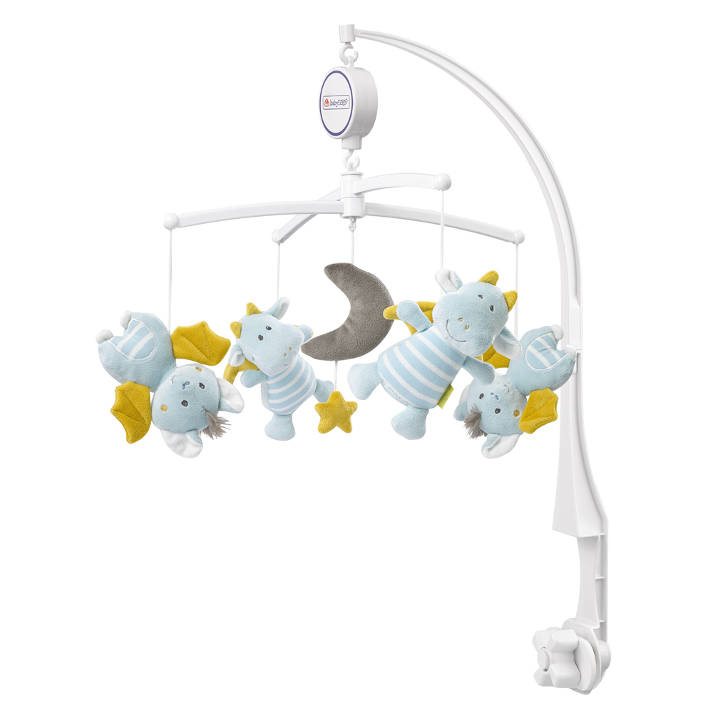 Hrací kolotoč s pěti plyšovými hračkami, které jsou umístěné na rameni, jež snadno upevníte k postýlce či ohrádce. Kolotoč se ovládá mechanickým spínačem on/off, kterým se ukolébavky spouští nebo vypínají. Děti se zabaví tančícími a točícími se hračkami, které hrají uklidňující melodii. Během dne vzbuzuje tančící drak a netopýr dětskou zvědavost, večer pomáhá uklidnit a uspat.