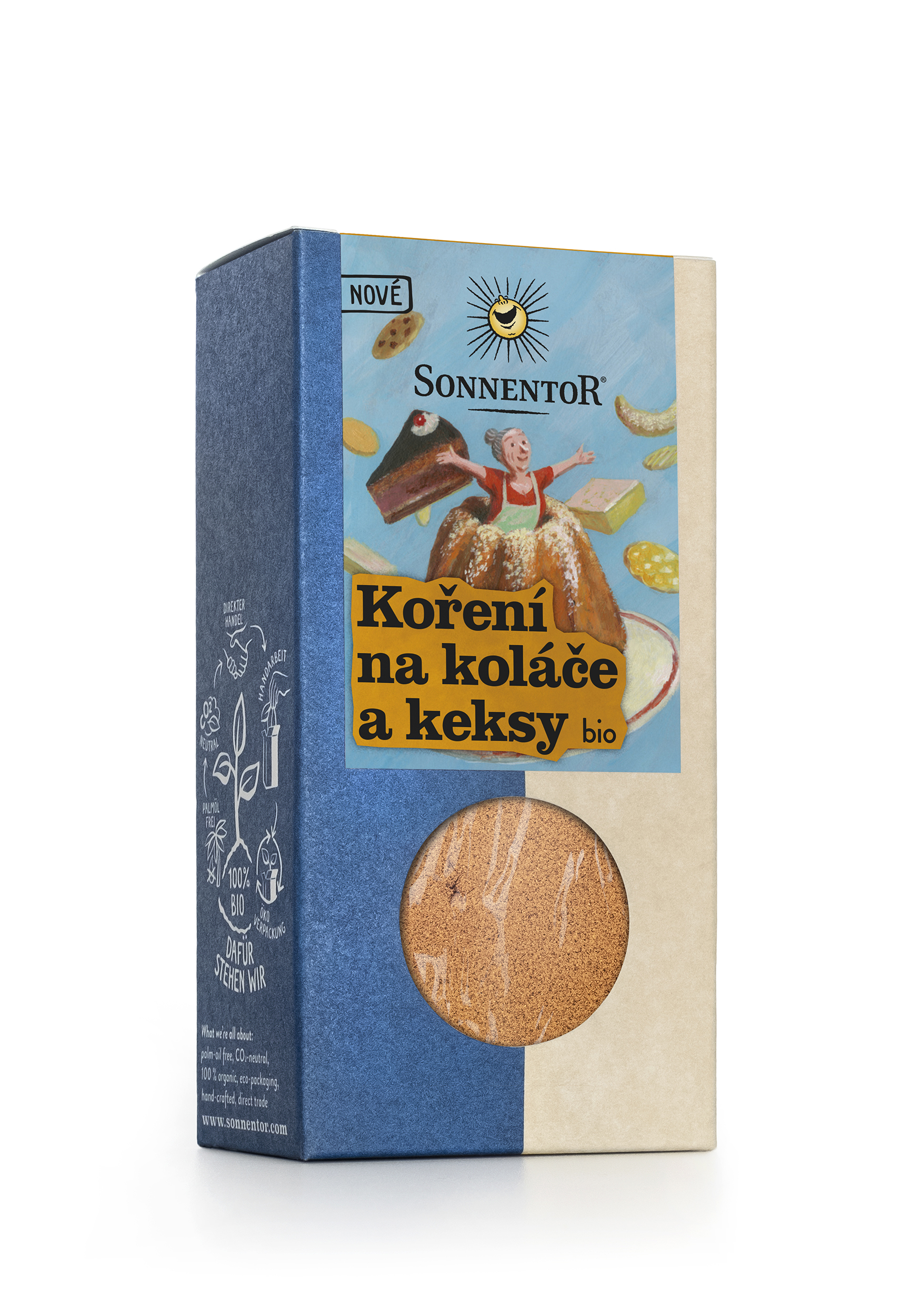Koření na koláče a keksy bio 50 g od výrobce Sonnentor. Produkt v bio kvalitě. Pěstováno metodou ekologického zemědělství.Pečlivě jsme sledovali naše babičky, jak jim pod rukama vznikají ty nejlepší koláče, sušenky a cukroví. Vyzkoušejte jejich tajemství i vy!Muškátový oříšek bio, mletý, Skořice...