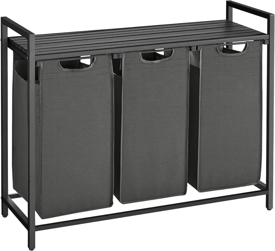 Koš na prádlo 3 přihrádky, koš na prádlo s odkládací plochou, pytel na prádlo z tkaniny Oxford, vytahovací odnímatelný, kovový rám, 3 x 38 l, 92,5 x 33 x 72 cm, černo-šedá  prečítať celé
