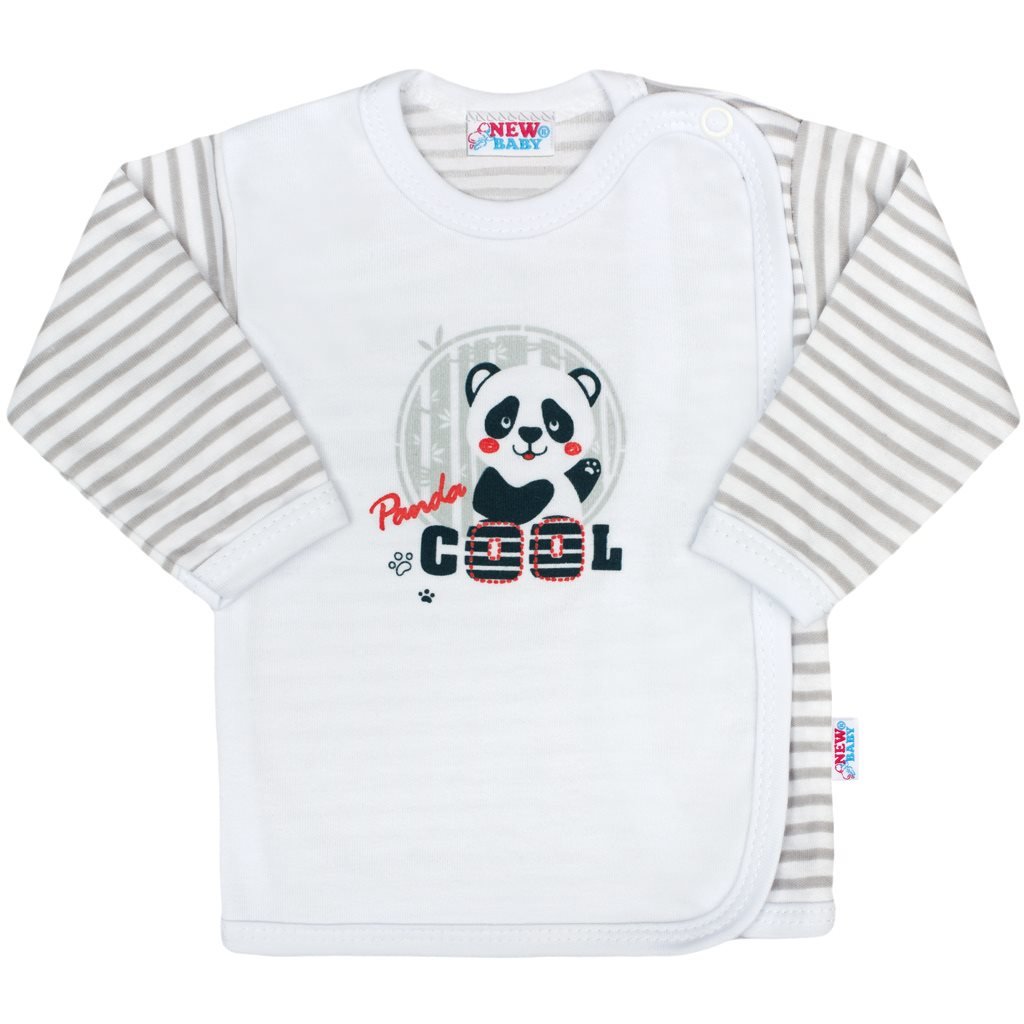 Bavlněná kojenecká košilka New Baby Panda pro miminka. Dětská košilka má rukávky a zadní stranu celopotištěnou moderními pruhy a přední strana je zdobena obrázkem pohádkové pandy a nápisem COOL. Praktické zapínání na cvočky na ramínku a boční straně usnadňuje oblékání a přebalování. Košilka s moderním designem je vhodná pro holčičky i chlapečky. Složení: 100% bavlna.