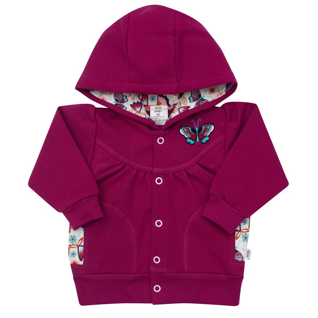 Holčičí mikinka s kapucí české značky New Baby Little Girl. Mikinka má zapínání na zip po celé délce, hlubší praktické kapsičky po stranách, které jsou lemované látkou s motýlky a pružný lem na rukávcích. Jemně nařasené rukávy, výšitý obrázek motýlka a kapuce podšitá bavlněnou podšívkou s motýlky...