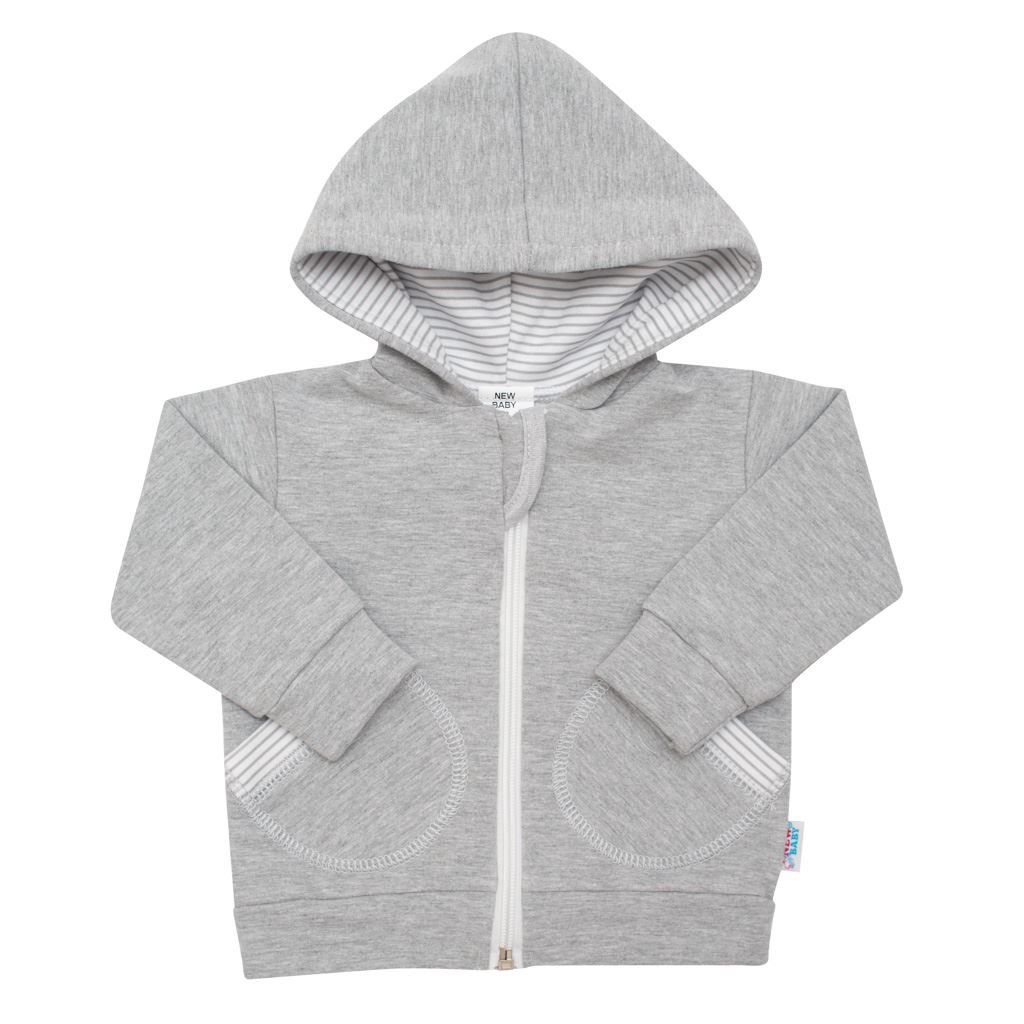 Mikinka s kapucí české značky New Baby For Girl and Boy. Mikinka má zapínání na zip po celé délce, hlubší praktické kapsičky, které jsou lemované látkou s pruhy, lem na rukávcích a v pase. Kapuce je podšitá bavlněnou podšívkou s pruhy, která je stále trendy. Vhodná pro holčičky i chlapečky. Materiál: 97% bavlna, 3% elastan.