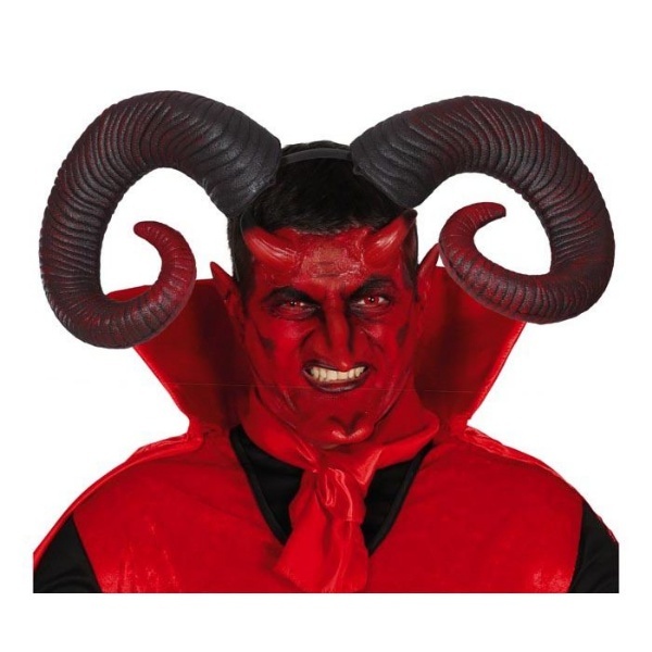 Čertovské rohy zahnuté - beraní 56 cm. Zahnuté rohy na gumičce, kterou jednoduše schováte do vlasů nebo paruky. Vhodná k čertovskému kostýmu ale i třeba ke kostýmu berana. Hodí se jako doplněk ke kostýmu ale i na halloweenskou party nebo karneval.