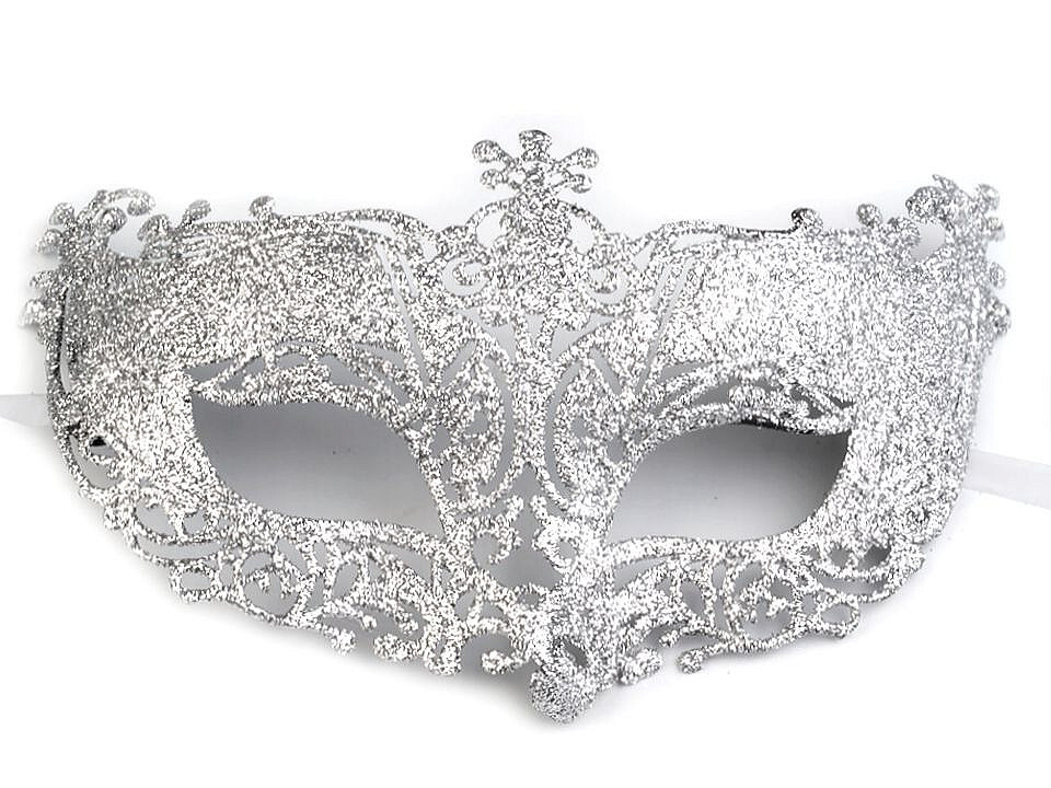Úchvatná škraboška vypadá jako by byla z jemné krajky. Je však vyrobená z pevného plastu, který dobře drží tvar. Třpytivé glitry dodávají masce dramatičnost. Zazáříte s ní na karnevalech, večírcích nebo na párty. Maska se zavazuje pomocí saténové stuhy. Jelikož jsou glitry na škrabošce nalepené, mohou lehce opadávat.
