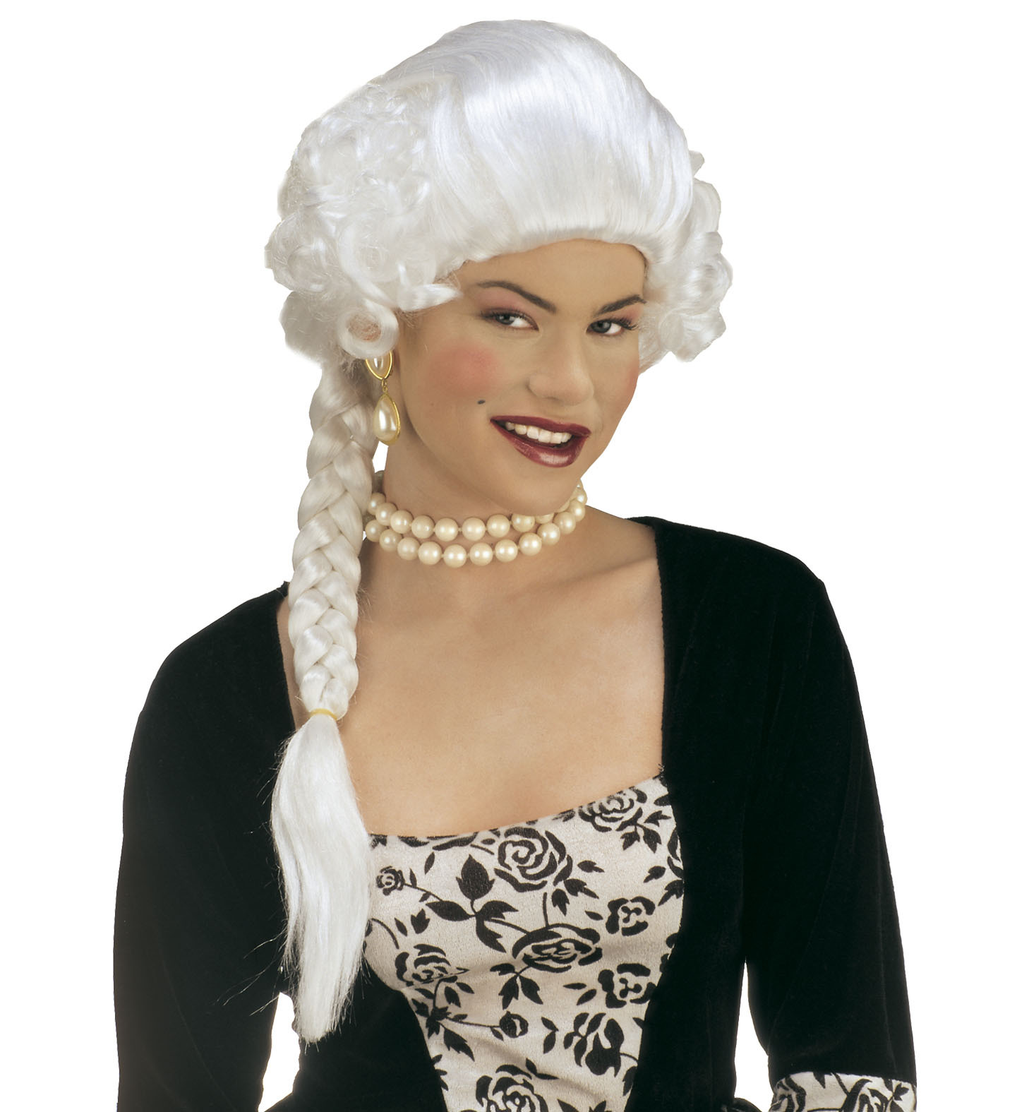 dobová paruka Josephine, baroko. Barva: bílá Materiál: 100% polyester Určeno pro: dámská Typ paruky: s copem prečítať celé