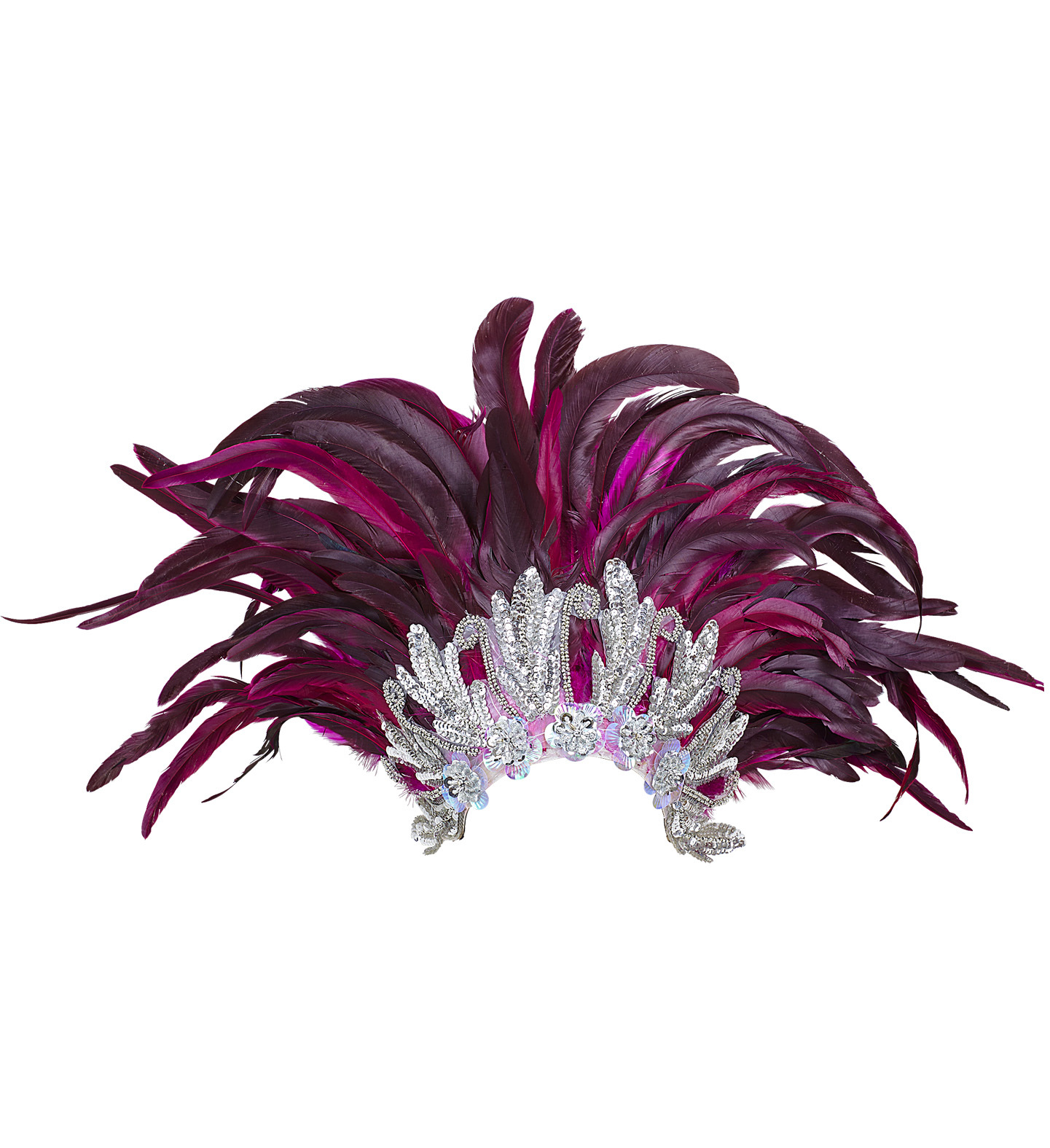 Fialová péřová čelenka se stříbrnou flitrovou dekorací, pro tanečnici ve stylu karnevalu v Riu. Materiál: 91% peří, 9% PE prečítať celé