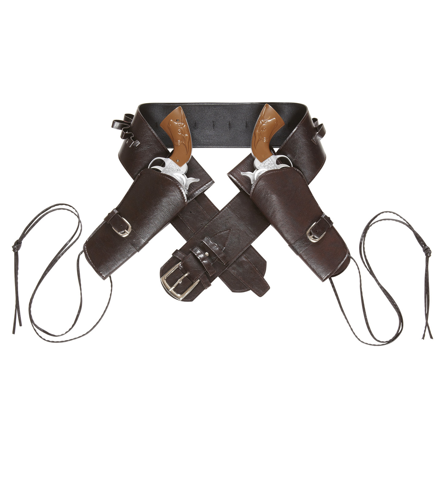 Autentický kovbojský opasek s 2 pouzdry na kolt, hnědý, se šňůrkami k přivázání pouzder ke stehnu,vel. 96-110, šířka pásku je 8 cm. Materiál: 100% PU prečítať celé