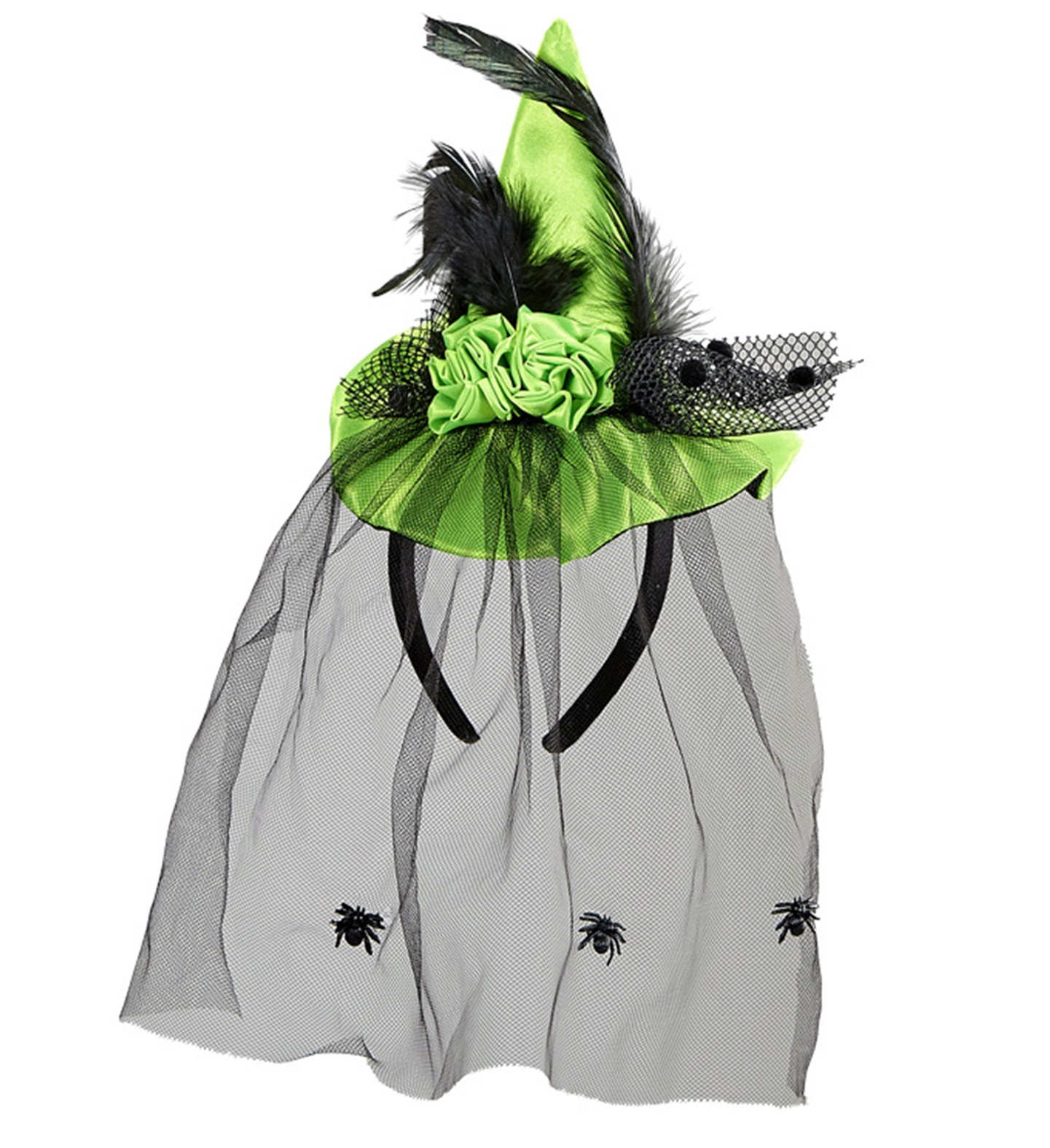 Čarodějnický miniklobouček na čelence s peřím, stužkou a závojem. Materiál: 100% Polyester. Barva: zelená prečítať celé