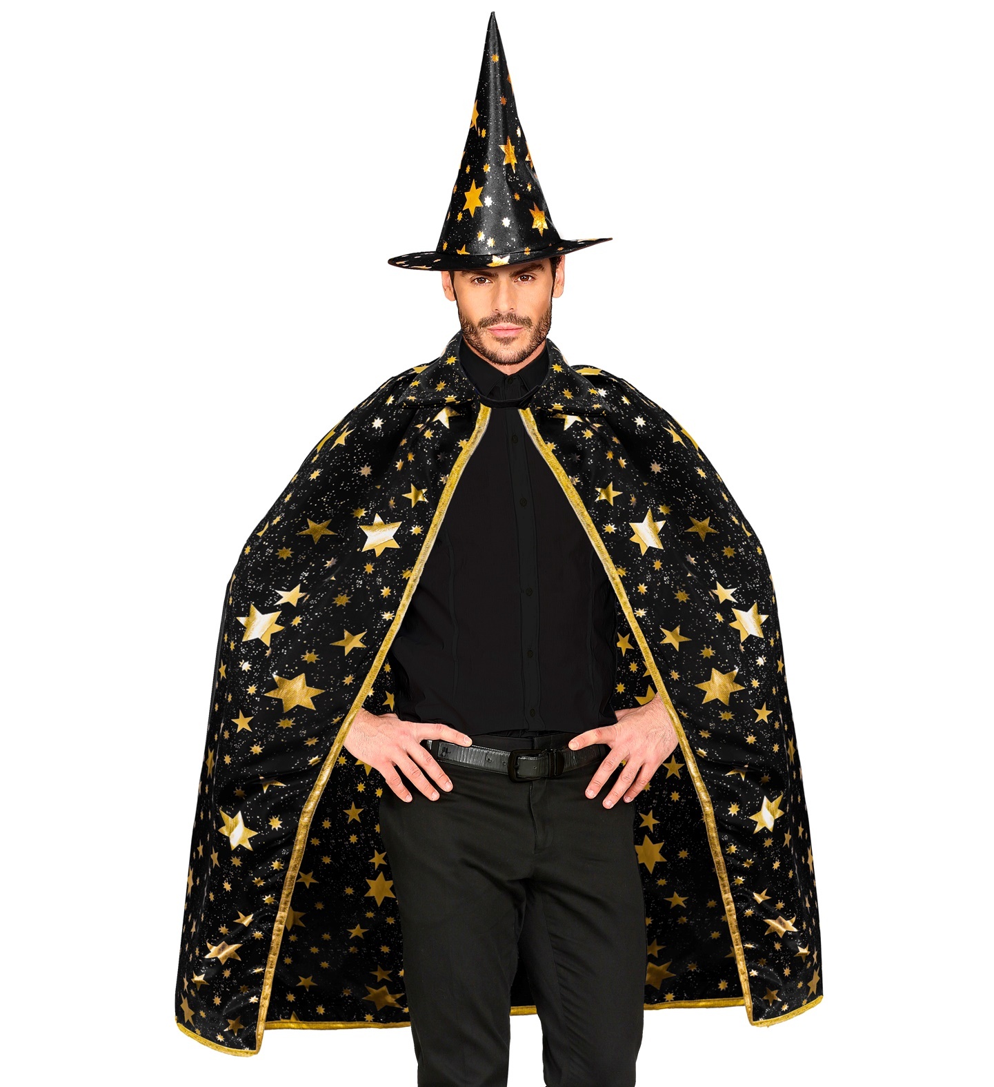 Černý plášť a kolobouk se zlatým hvězdným potiskem. Pro tajuplný převlek za čaroděje, nebo čarodějnici. Délka pláště: 85 cm Materiál: 100% acetát Barva: černá prečítať celé