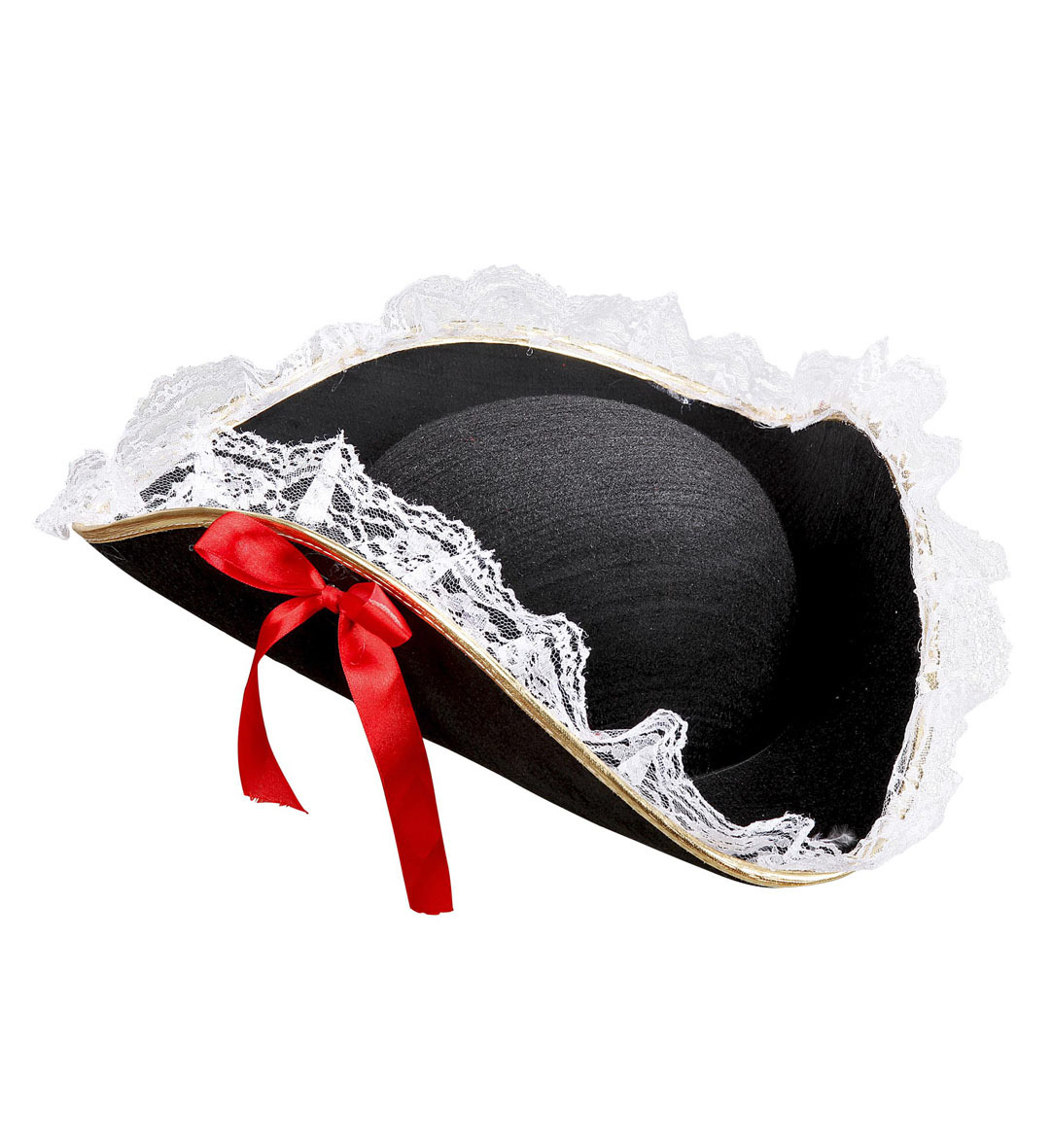 Černý ozdobný plstěný třírohý klobouk s krajkou a stužkou. Materiál: 100% polyester Obvod hlavy: 61 cm prečítať celé