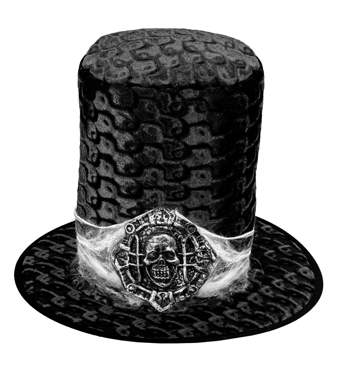 Vysoký sametový cylindr s šedivou stuhou a znakem, vhodný jako doplněk na Halloween. Obvod hlavy: 59 cm Materiál: 100% polyester prečítať celé