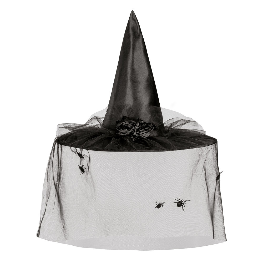 Luxusní černý čarodějnický klobouk s peřím, závojem, květinou a pavoučky. Obvod hlavy: 58 cm Materiál: polyester prečítať celé