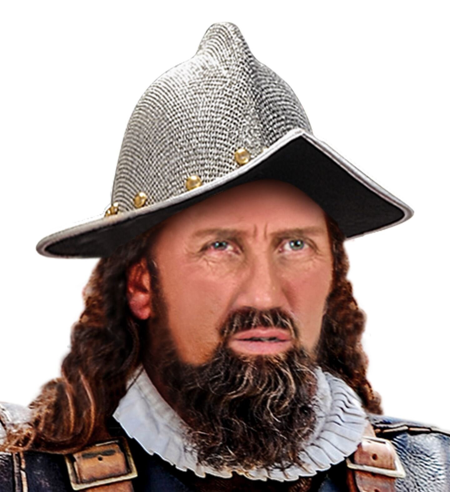 Stříbrná helma středověkého španělského dobyvatele. Materiál: 100% polyester Barva: stříbrná Velikost: dospělá prečítať celé