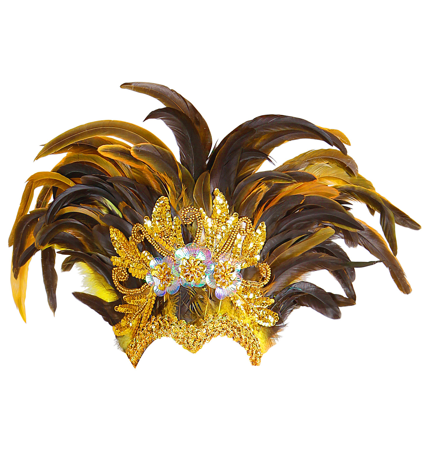 Zlatá čelenka s peřím ve stylu Inků, karneval v Riu.Zlaté flitry se zlatými květy. Vzadu uchycení kolem hlavy gumičkou. Materiál: 91% peří, 9% PE prečítať celé
