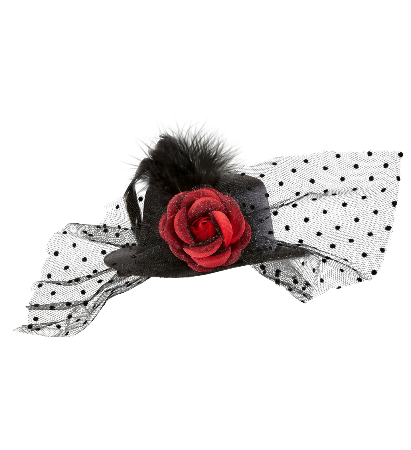 Černý miniklobouček s puntíkatou stužkou, peřím a červenou růží. Materiál: Polyester prečítať celé