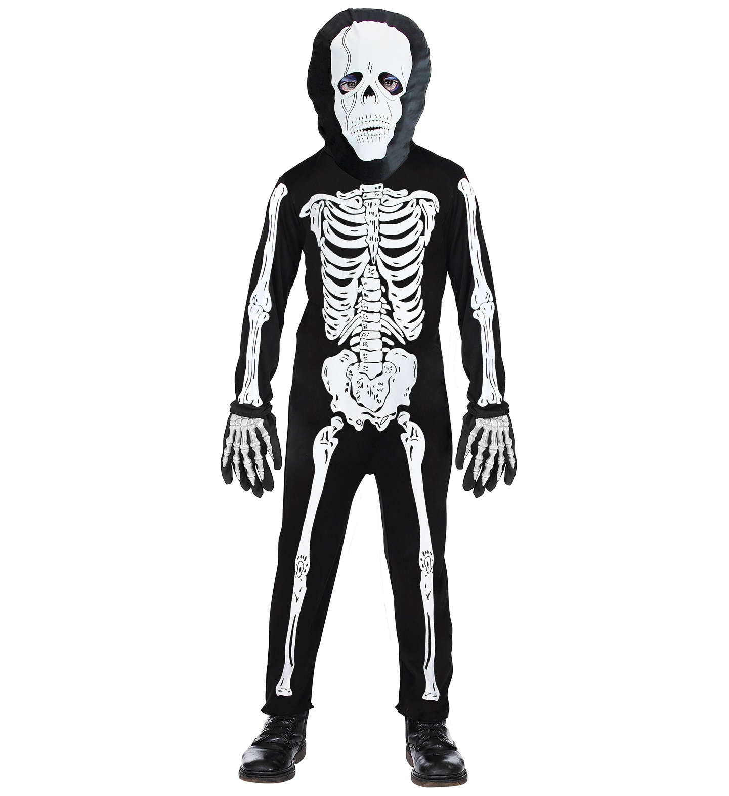 Karnevalový halloweenský kostým kostlivce pro děti. Kostým skeleton obsahuje: kombinézu s kapucí a maskou přes obličej, neobsahuje rukavice. Materiál: 100% Polyester Velikost: 4-5 let, 116 cm prečítať celé