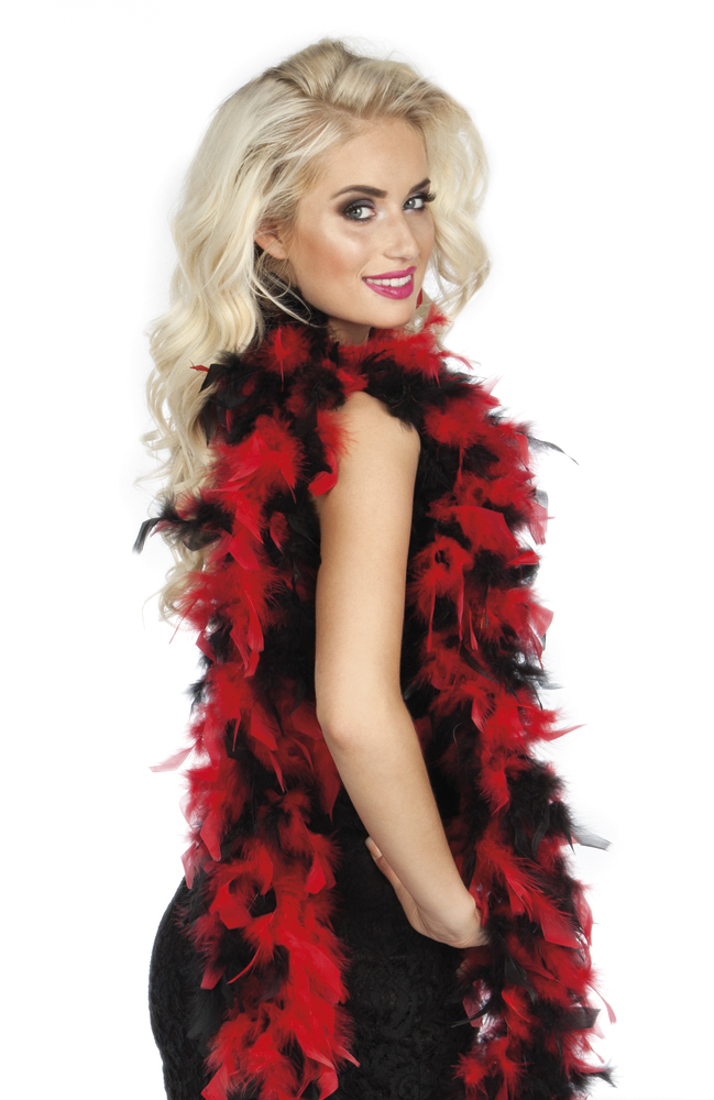 Dekorační boa z peří, dvoubarevné, doplněk retro kostýmu. Délka: cca 180 cm Hmotnost: 50 g., Materiál: 98% peří, 2% cotton Barva:: červeno-černá prečítať celé