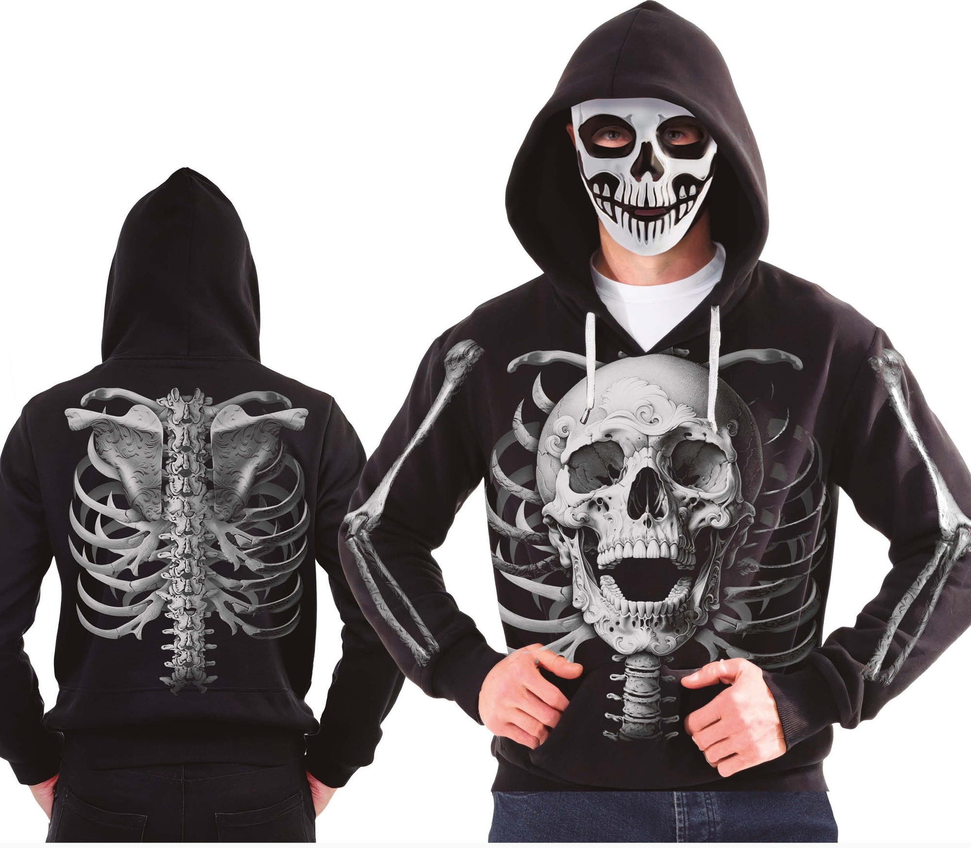 Připravte se na strašidelnou zábavu s touto pánskou mikinou s kapucí a maskou, která je perfektní volbou pro Halloween nebo tematické večírky. Mikina je vyrobena ze 100% polyesteru a zdobena detailním motivem kostry, který pokrývá přední i zadní část, včetně rukávů. Kapuce dodává kostýmu...