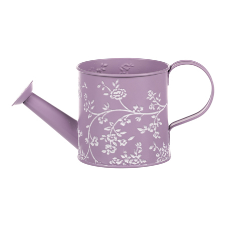 Obal kovový - konev, ve světle fialové barvě s bílými růžemi.
