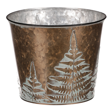 Obal z kovu na květiny, v měděné barvě s kapradím.