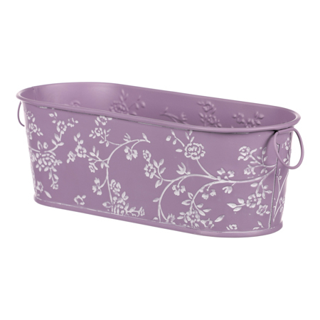 Obal kovový - truhlík, ve světle fialové barvě s bílými růžemi.