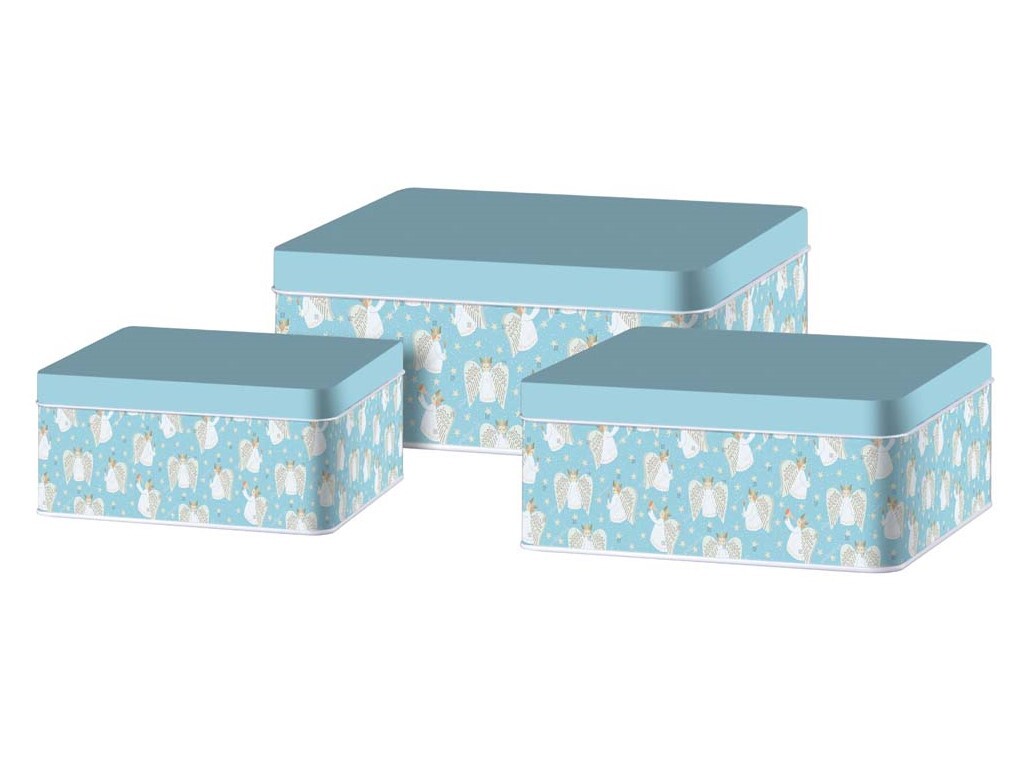 Plechová hranatá dóza Angel's Wings, modrá, set 3 ks, 210x210x83/180x180x75/150x150x70mm