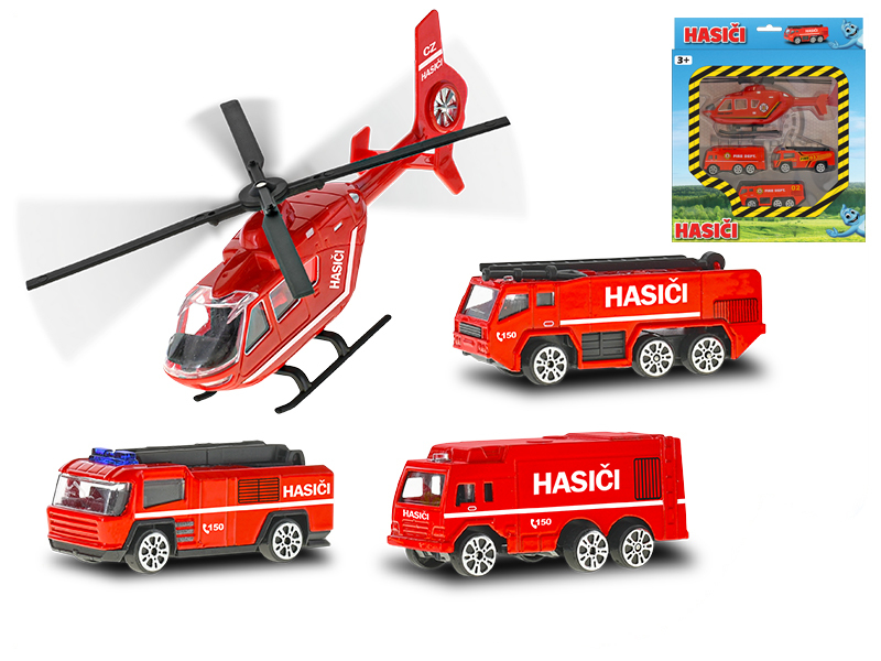 Vozidla hasiči 3ks s vrtulníkem 1ks v krabičce