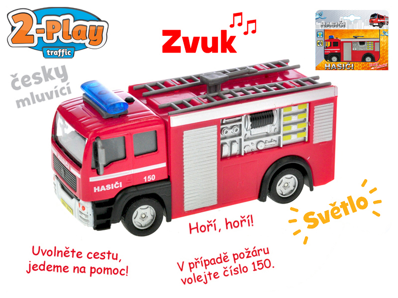 Toto hasičské auto na batérie má spätný chod - stačí ho natiahnuť dozadu a rozbehne sa vpred rýchlosťou hasičského vozidla na ceste k zásahu. Navyše hovorí po česky a sprevádza svoj pohyb varovným svetlom a hlasovým hlásením, ktoré upúta pozornosť každého malého i veľkého nadšenca. Na autíčku je zreteľne uvedené telefónne číslo 150, ktoré si deti ľahko zapamätajú, čo môže mať v krízovej situácii veľký význam.