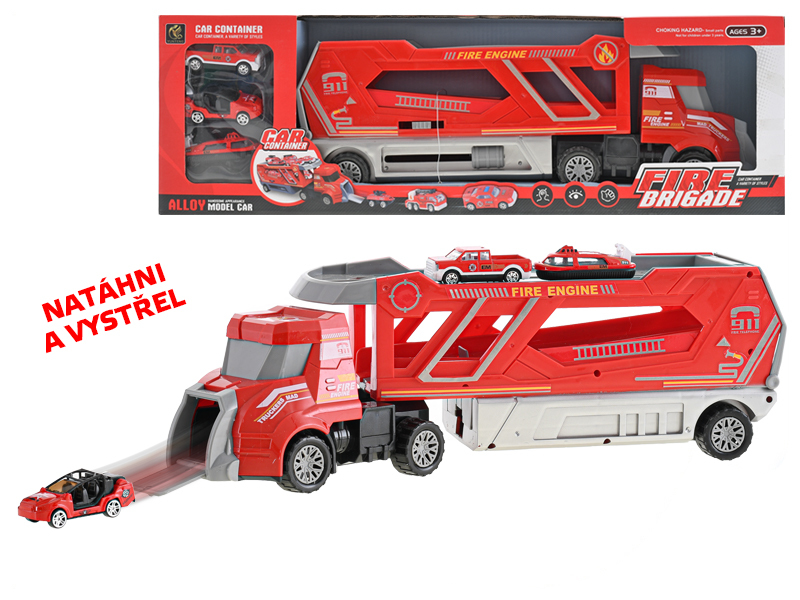 Přepravník aut hasiči 41cm na volný chod + 3auta 6cm kov na volný chod v krabičce