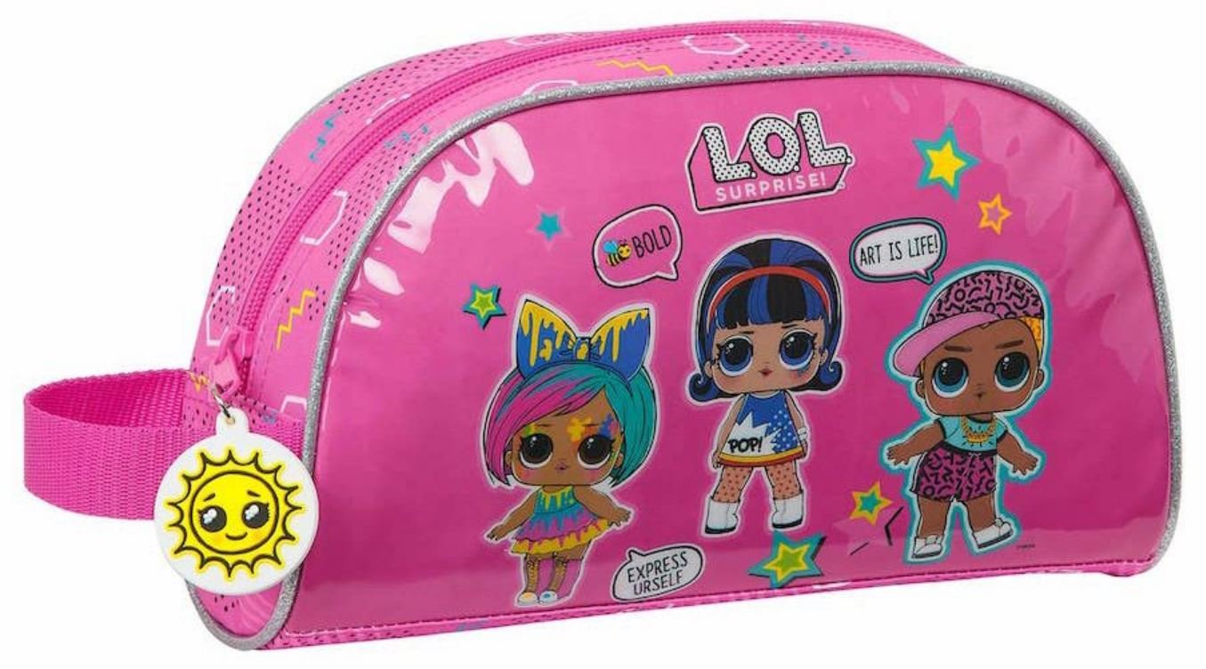 Růžová kosmetická taška vyvedená v motivu sestřiček L.O.L. Surprise.