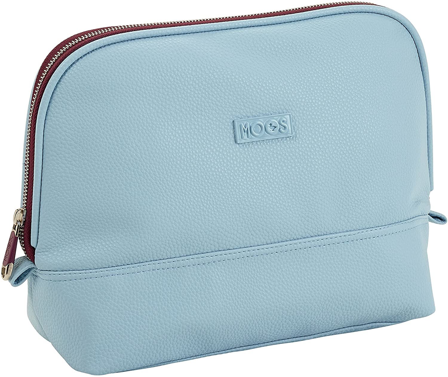 Pastělově modrá kosmetická taška vyvedená v motivu značky Moos se zapínáním na zip.