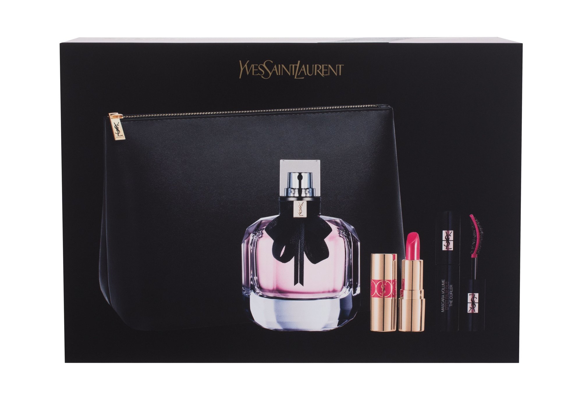 Yves Saint Laurent Mon Paris parfémovaná voda 90 ml + řasenka Mascara Volume Effet Faux Cils The Curler 2 ml No.1 + rtěnka Rouge Volupté Shine 1,4 ml No.49 + kosmetická taštička