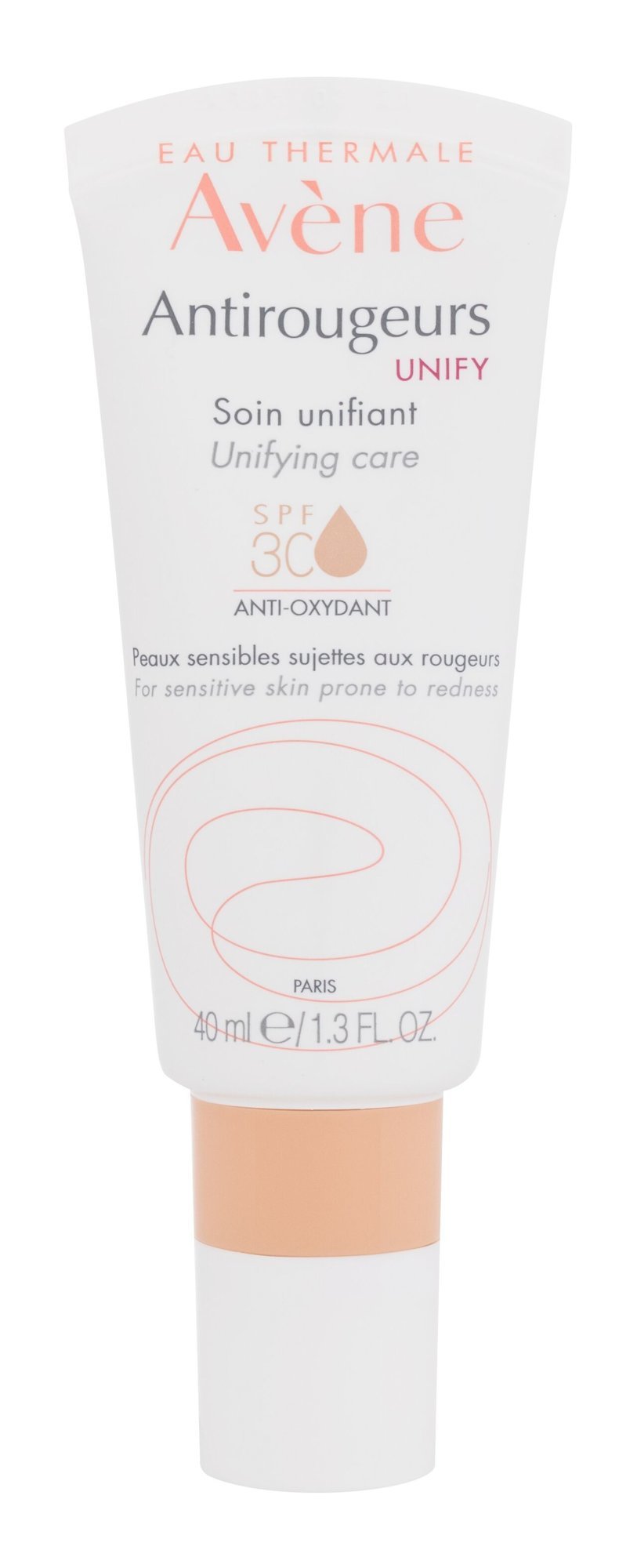 Ochranný tónující krém Avene Antirougeurs Unify SPF30 Unifying Care je určený pro pleť náchylnou k podráždění a zarudnutí(růžovce). Složení obohacené o termální vodu Avène a patentovanou látku TRP-Regulin™ pleť zklidňuje a omezuje vznik zarudnutí po dobu 6 hodin.