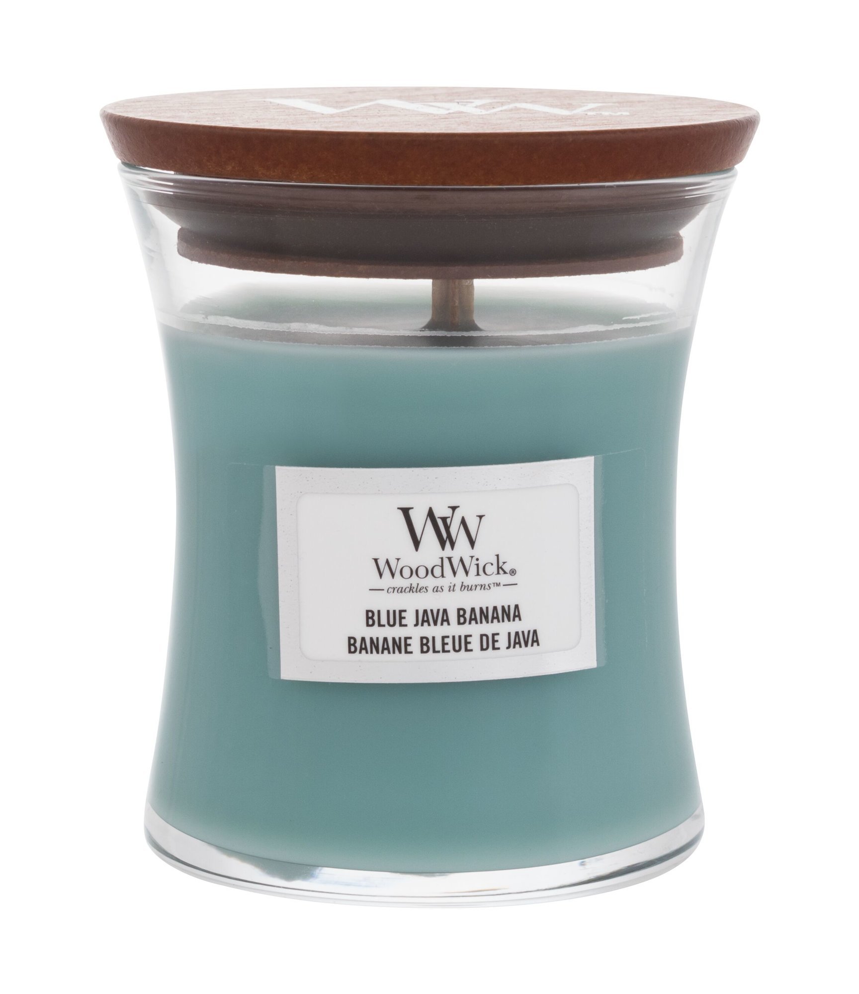 Vonná svíčka WoodWick Blue Java Banana je vyrobená ze směsi prémiového parafínu a sójového vosku s vysoce koncentrovanými vůněmi. Inovativní přírodní dřevěný knot Pluswick® Innovation vytváří uklidňující zvuk praskajícího ohně.
