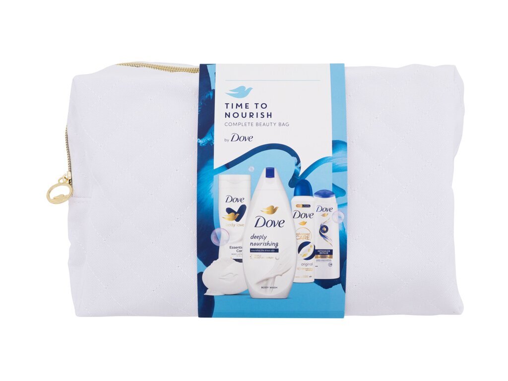Dove Time To Nourish sprchový gel Deeply Nourishing 250 ml + tuhé mýdlo Original Beauty Bar 90 g + antiperspirant Advanced Care Original 150 ml + tělové mléko Body Love Essential Care 250 ml + šampon Intensive Repair 250 ml + kosmetická taštička