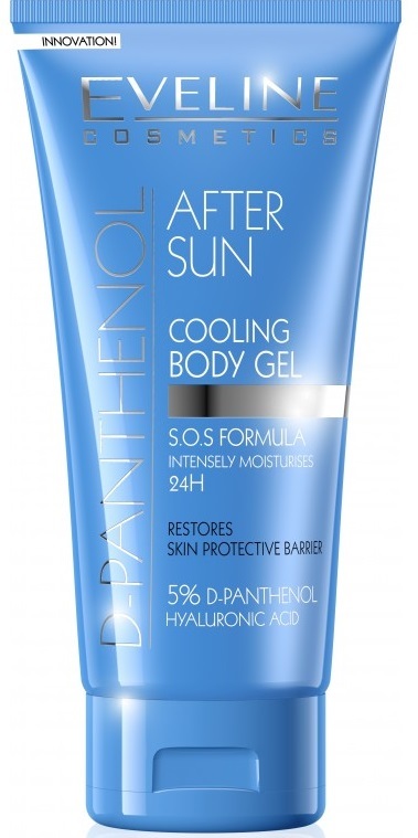 Hluboce hydratační gel po opalování Eveline D-Panthenol After Sun Cooling Body Gel obsahuje 5% D-panthenol a antioxidační komplex Bioprotect®, okamžitě zklidňuje podrážděnou pokožku po nadměrném slunění.