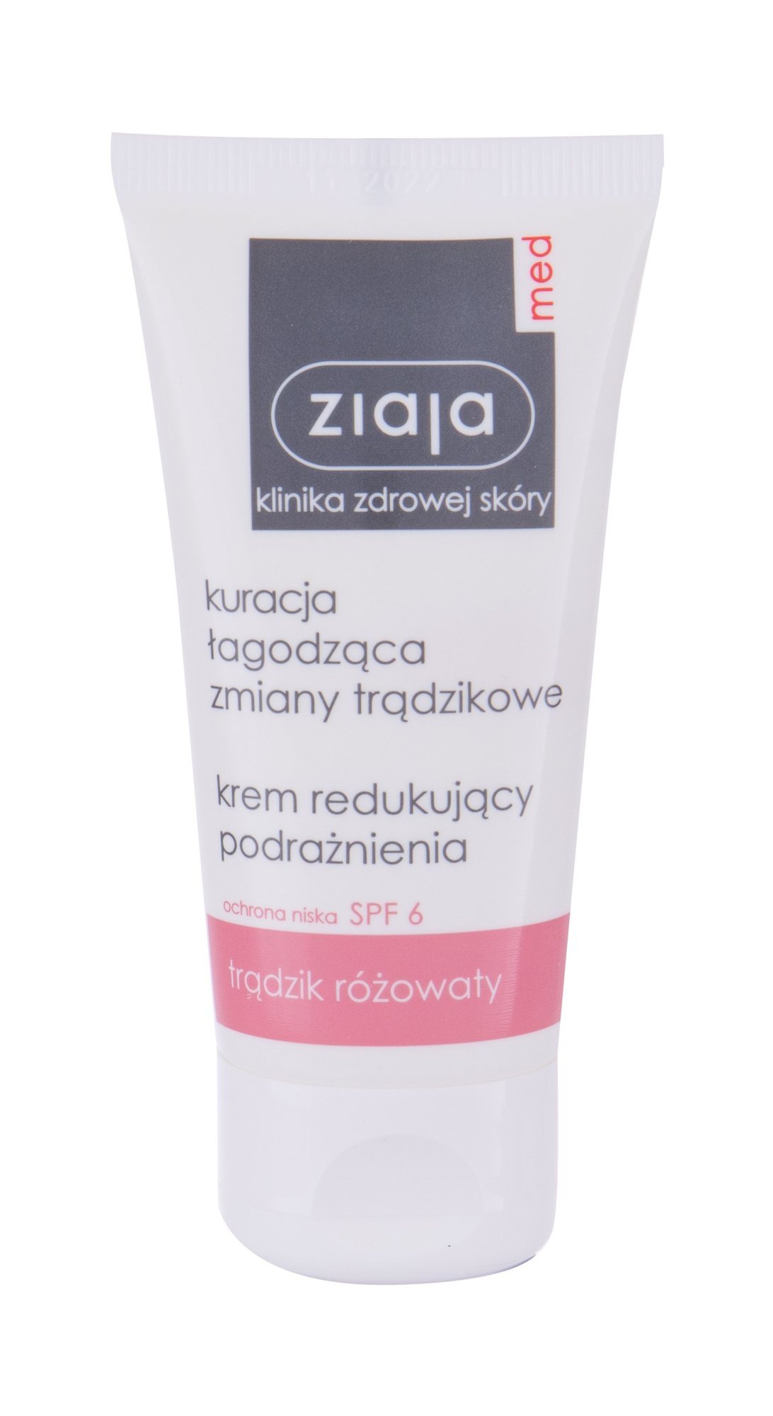 Trápí vás aknózní pleť se sklonem k zarudnutí? Již od 12 let věku můžete používat denní krém Ziaja Med Acne Lesions Soothing Day Cream SPF6. Dermatologicky testovaný přípravek se širokým spektrem účinků je hypoalergenní a bez parfemace. Využívá se i jako antibakteriální kúra pro zklidnění rosacey (růžovky).
