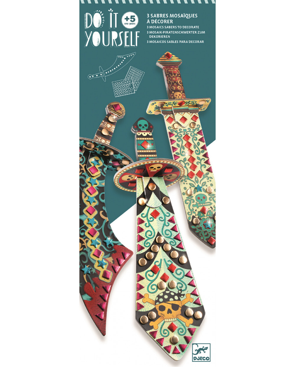 Vyrobit si svůj vlastní meč je snem každého rytíře, tak pojďte do toho. Balení obsahuje tři meče z tvrdého kartonu, tři třpytivé chrániče ruky, čtyři barevné lesklé papírky s různými tvary k dotvoření krásně třpytivých a vykládaných mečů o velikosti 10x37cm. Pro děti od 5 let. Velikost balení: 20 x 40 x 4 cm.