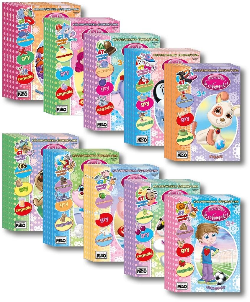 Seria "Słodkie kolorki" to więcej niż kolorowanki - na 16 stronach na dzieci czeka mnóstwo niespodzianek! Nigdzie indziej nie znajdą tylu kosmicznych gier, zagadek, opowiadań, ani nie stoczą tylu twórczych bitew na kolory z naszymi bohaterami! Niech nie czekają dłużej! Niech ta wspaniała zabawa wreszcie się rozpocznie! Pakiet zawiera mix 50 kolorowanek Pakiet sprzedawany jest jako całość, a zwrotowi podlega tylko nienaruszony zestaw !!!