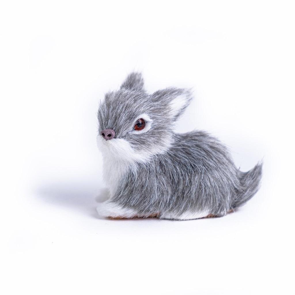 Wysokiej jakości figurka szaro-białego króliczka pokryta miękkim futerkiem.