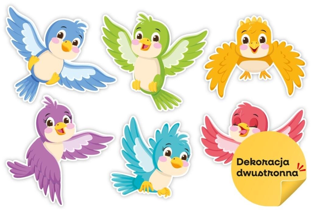 Zestaw zawiera 6 kolorowych elementów w wersji dwustronnej! Idealne na okno!Dekoracje są wycięte, gotowe do powieszenia.Zestaw składa się z 6 słodkich fruwających ptaszków. Idealny do wiosennej dekoracji szkoły czy przedszkola.Może być użyty do szkolnej gazetki czy jako scenografia...